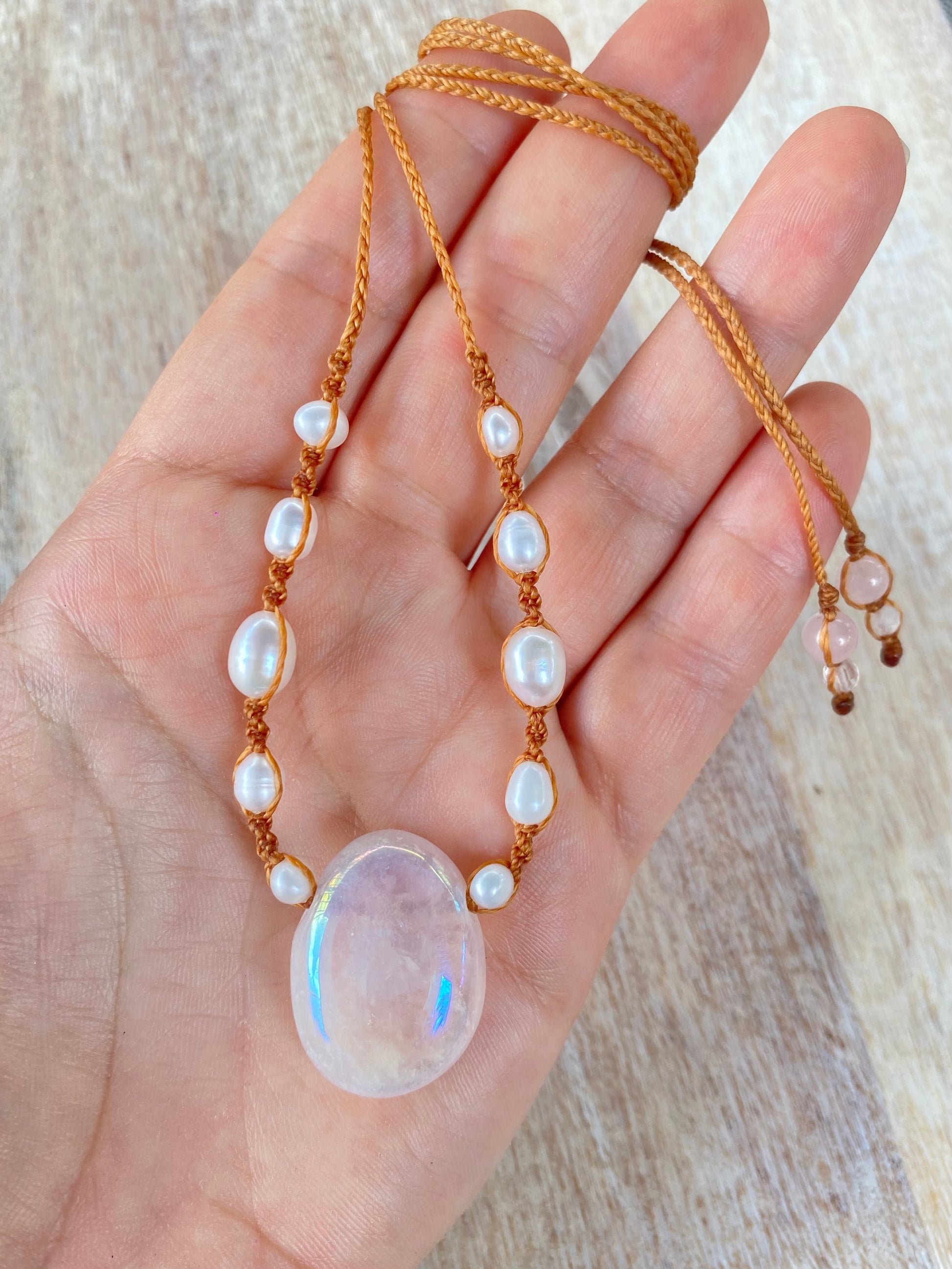 Handwoven macrame style, the Astra necklace showcases a mesmerising Angel Aura Rose Quartz, enhanced by delicate freshwater pearls.