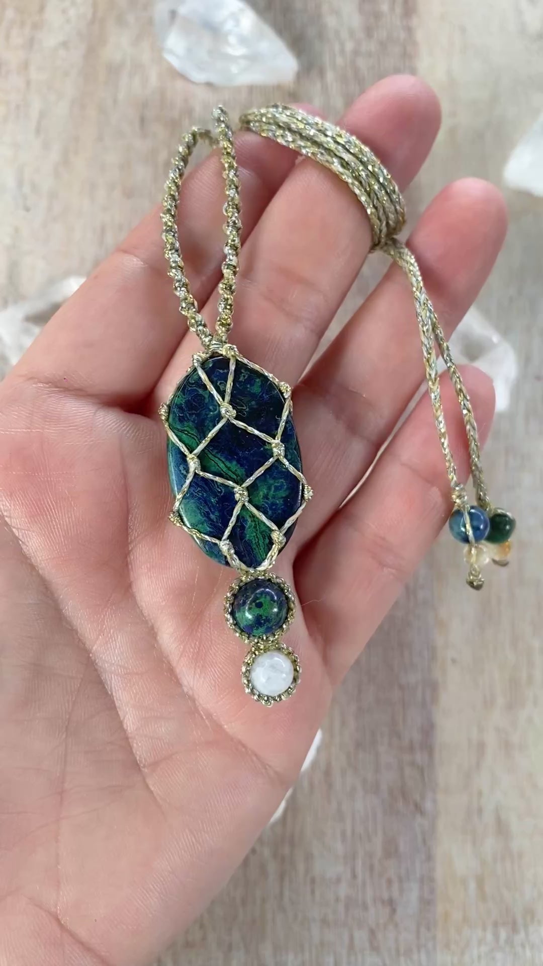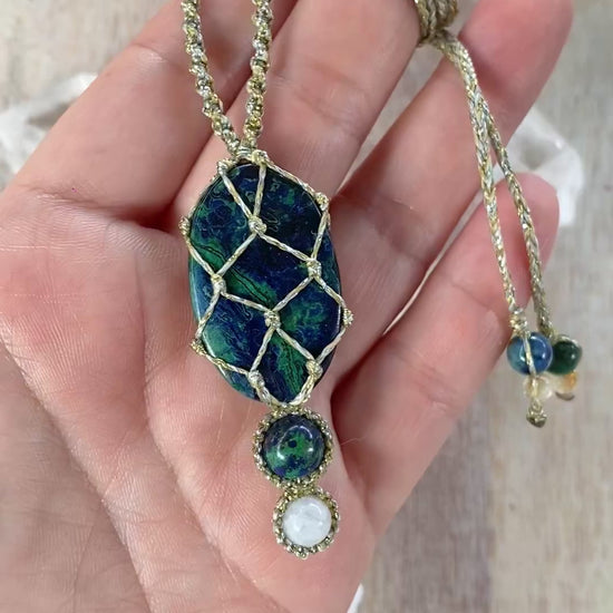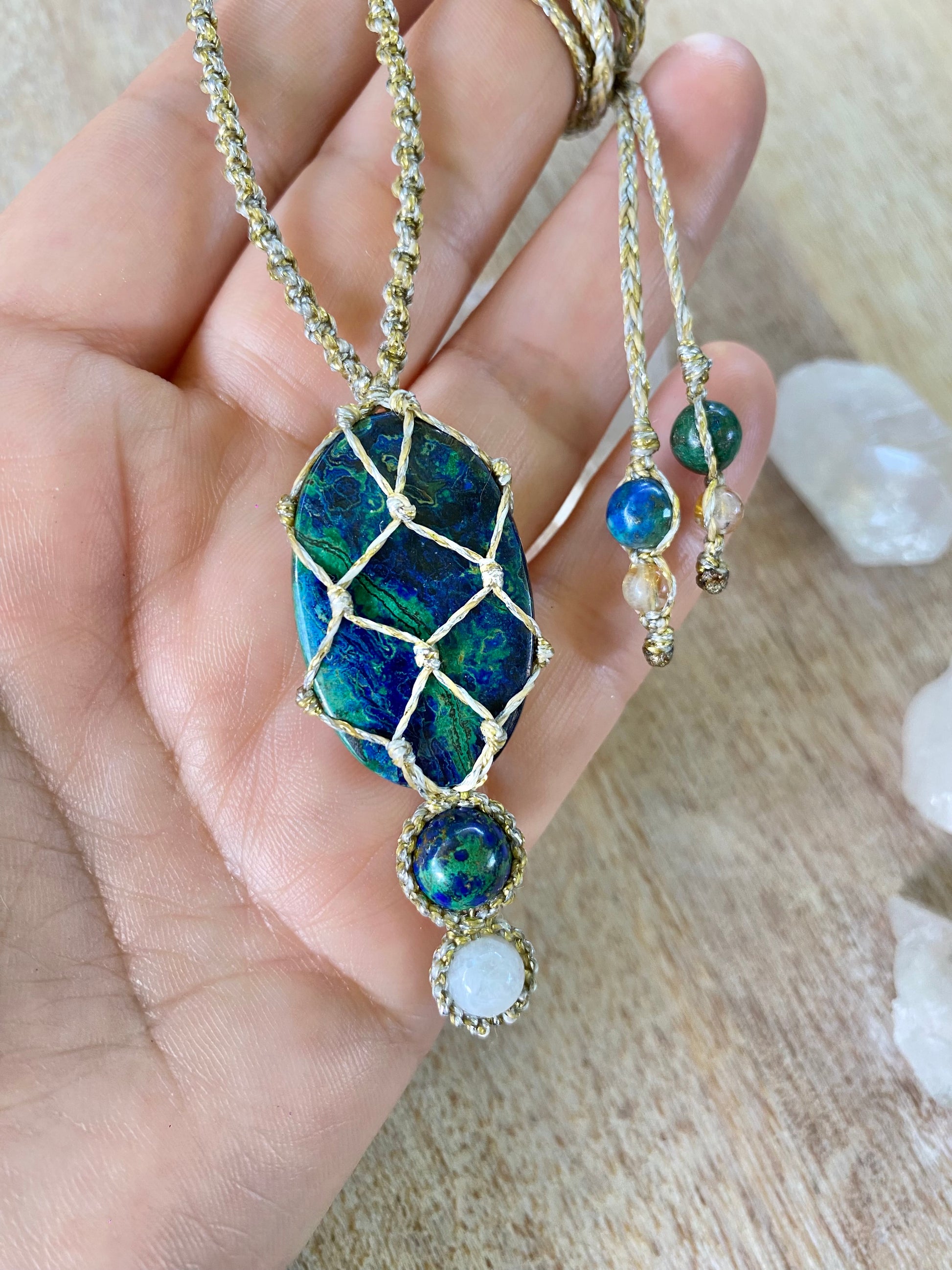 Saskia features a captivating Azurite stone, celebrated for its deep blues and association with intuition, insight, and inner vision. An Azurite bead rests underneath, enhancing its transformative properties, while a Moonstone bead anchors the piece, known for its calming properties and connection to intuition and emotional balance. 💙
