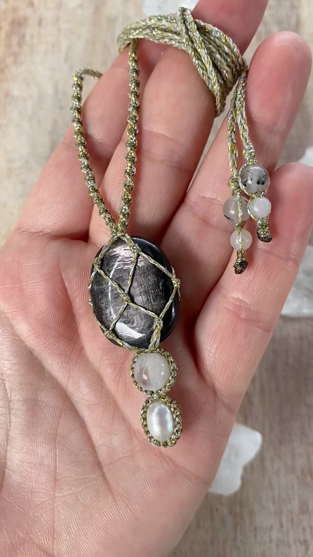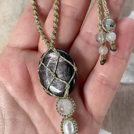 Juliet begins with a rare Hypersthene, embodying the energy of grounding and clarity. Known for its properties of insight, hypersthene invites tranquility and emotional healing. Below, a labradorite bead connects to ancient wisdom and balance, believed to bring prosperity and protection to its wearer, with a fresh water pearl below that.