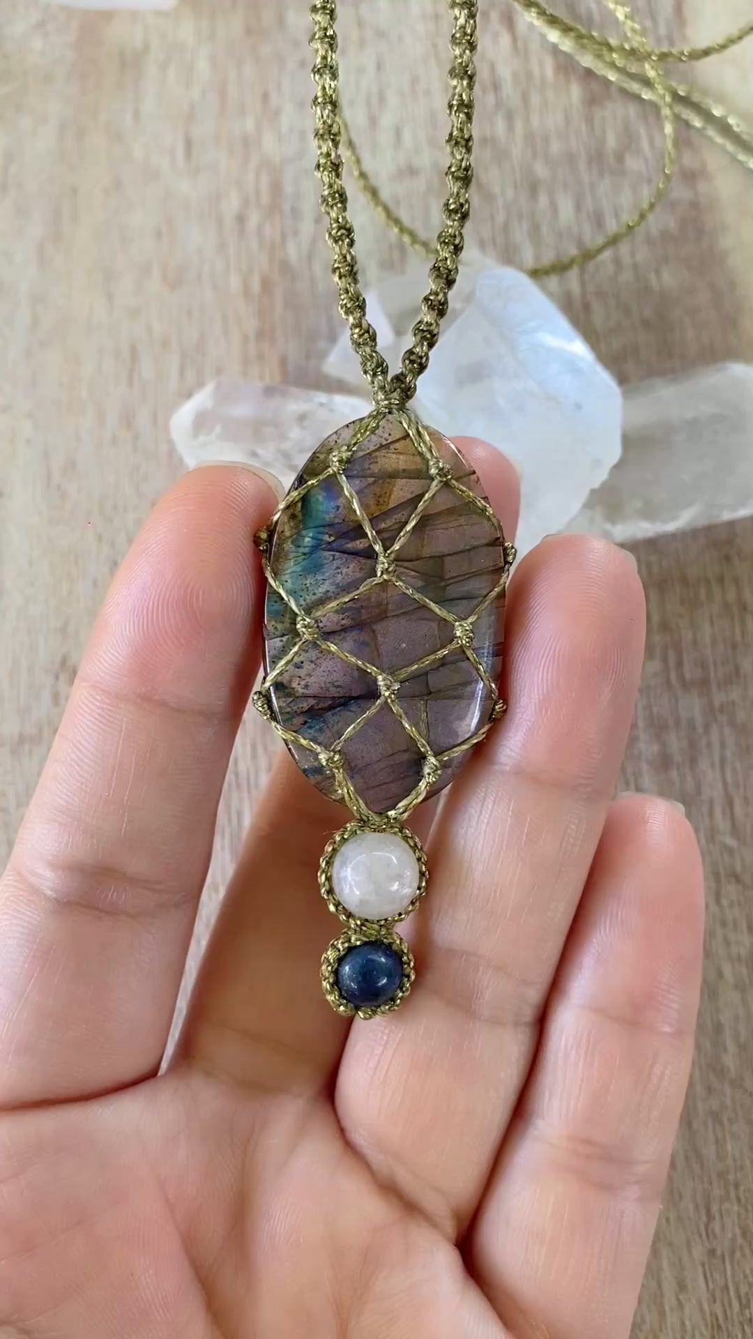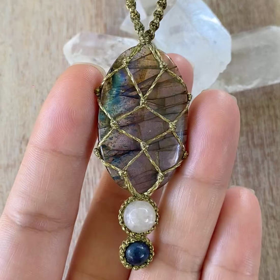 Nova features a captivating Labradorite stone, celebrated for its association with intuition, enhancing mental clarity, and spiritual insight. A Moonstone bead rests underneath, evoking a sense of mystery and transformation, while an Azurite bead anchors the piece, known for its calming properties and connection to purity.